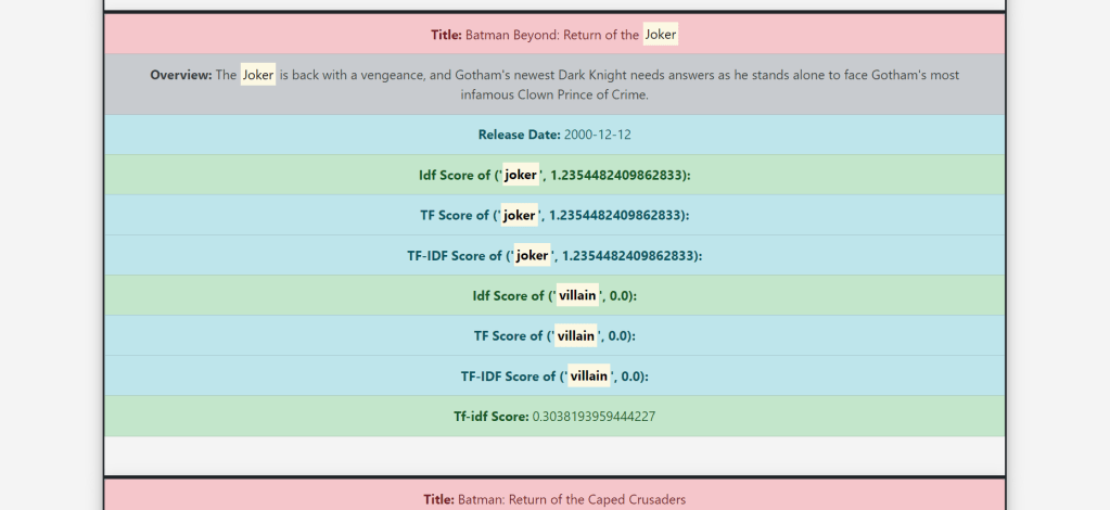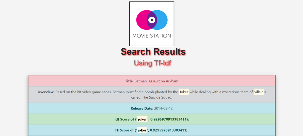 - And Finally display Tf score, Idf Score, Tf-Idf score,Release date, Overview and Title on the frontend.