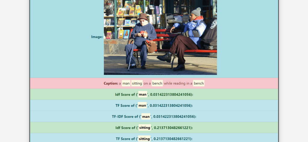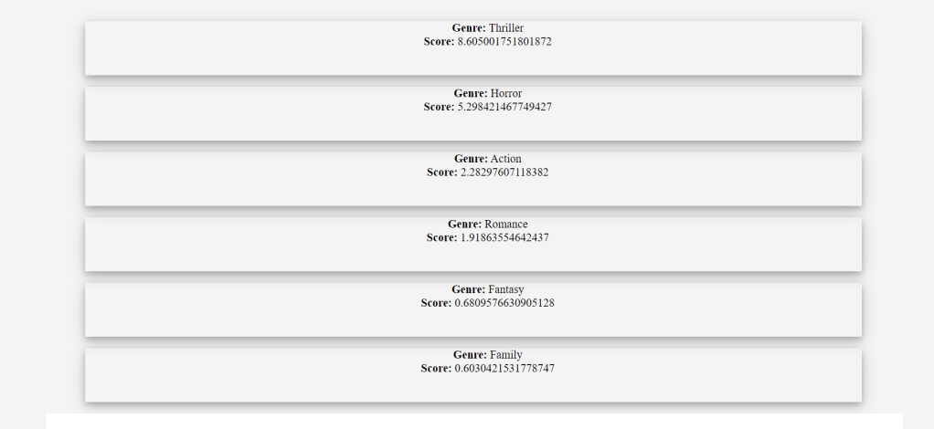 - And Finally display Tf score, Idf Score, Tf-Idf score,Release date, Overview and Title on the frontend.